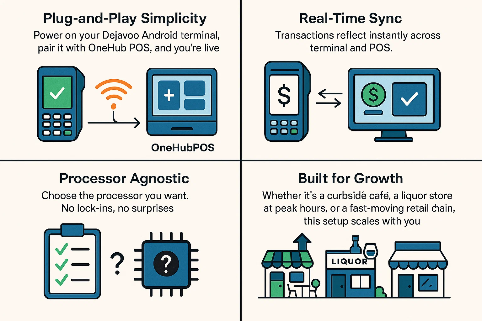 The OneHubPOS x Dejavoo integration rips out that complexity and replaces it with something merchants actually want: plug, play, and get paid. Plus, the payment terminals sync in real-time with the POS and are processor agnostic.