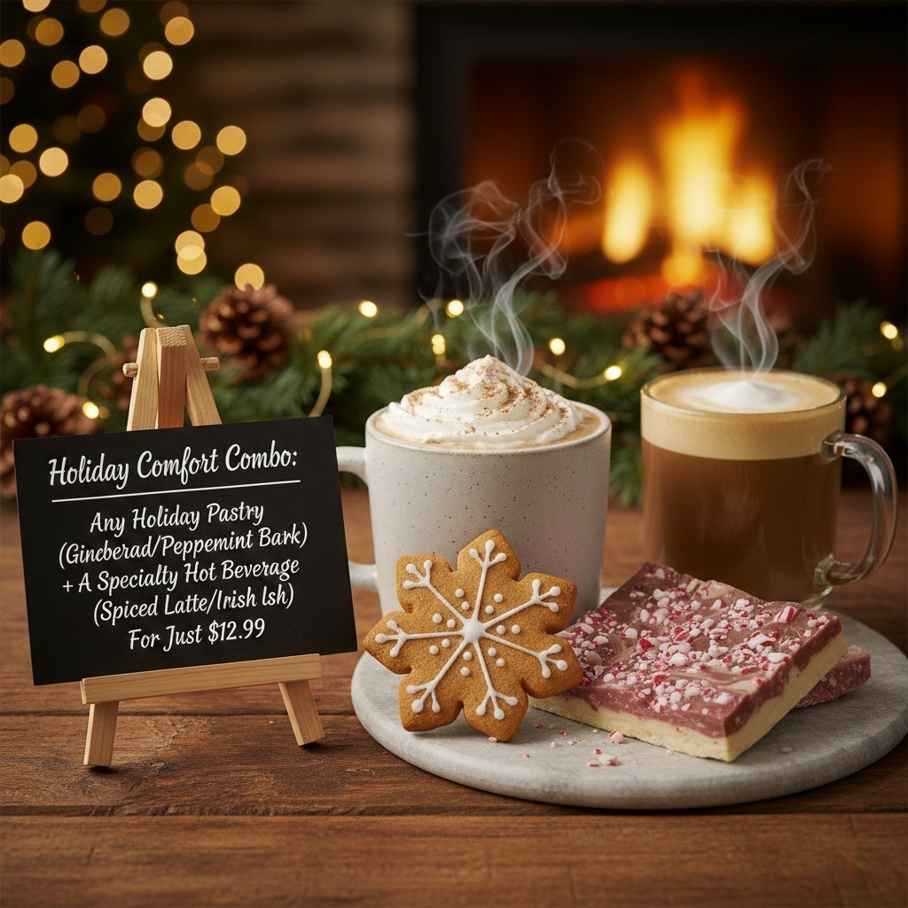 - The Combo: Any Holiday Pastry (Gingerbread/Peppermint Bark) + A Specialty Hot Beverage (Spiced Latte/Irish Coffee) for a fixed price.